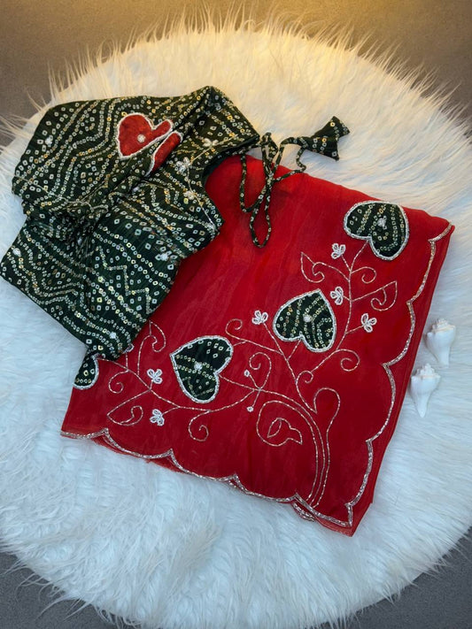 Special Bandhani Gota Patti Handwork Saree | Soft Silk Bandhej Print Saree with Contrast Blouse