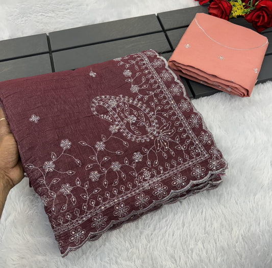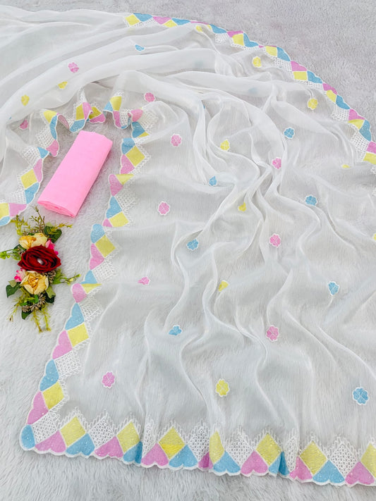 Pure Chinnon chiffon with cutwork border with Real Jarkan Diamond